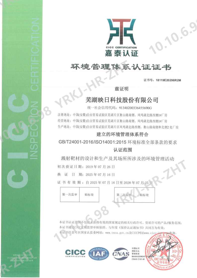 ISO14001環(huán)境管理體系認(rèn)證證書